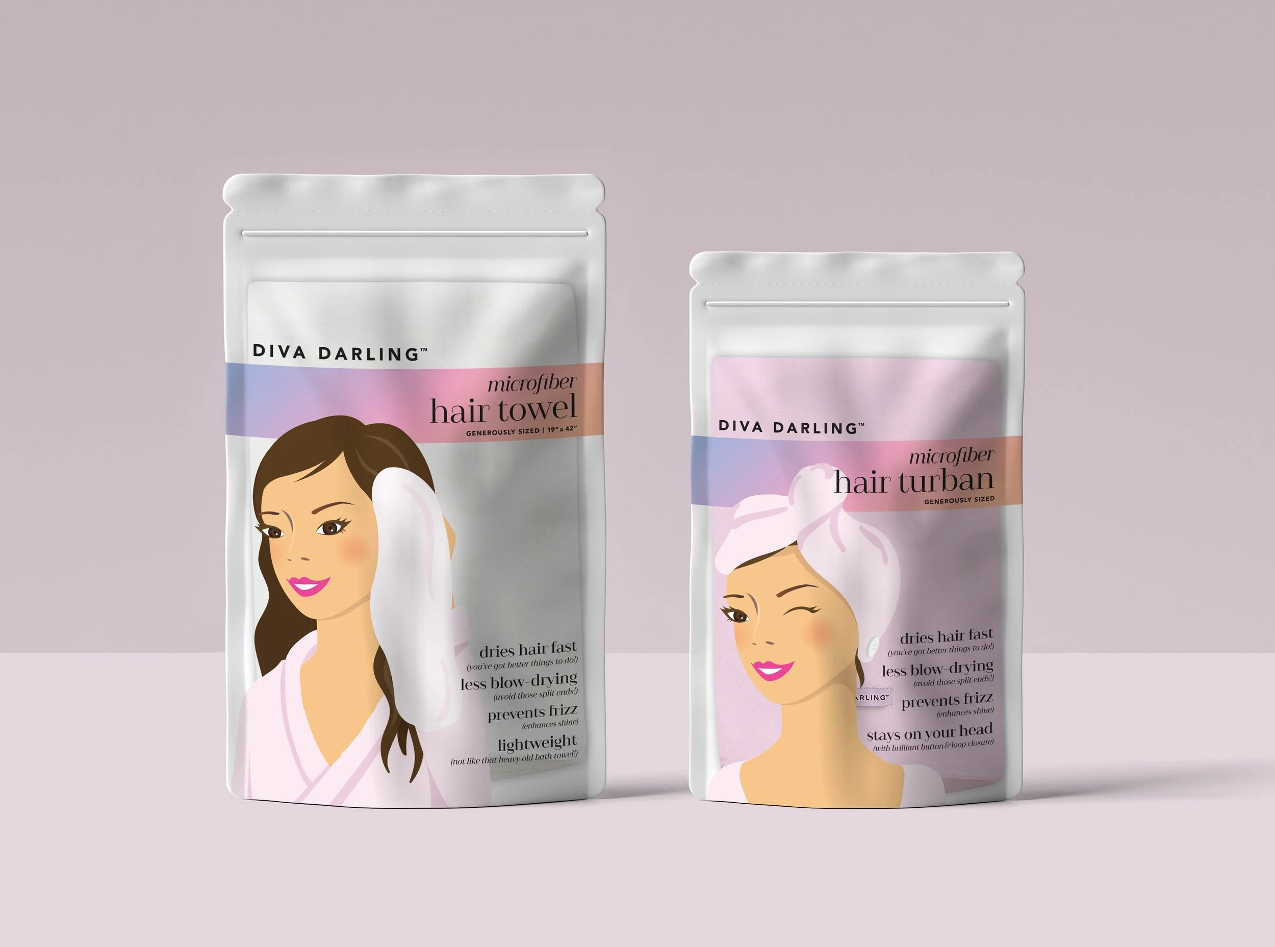 Diva Darling is a sister company of a well known hair towel brand Aquis. Their products were created for a younger audience- mainly targeting teenagers. They hadn’t updated their design in over 10 years and was more than ready for an update. My client wanted to keep the fun, whimsical voice but with a modern and sophisticated twist to it.